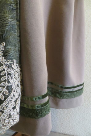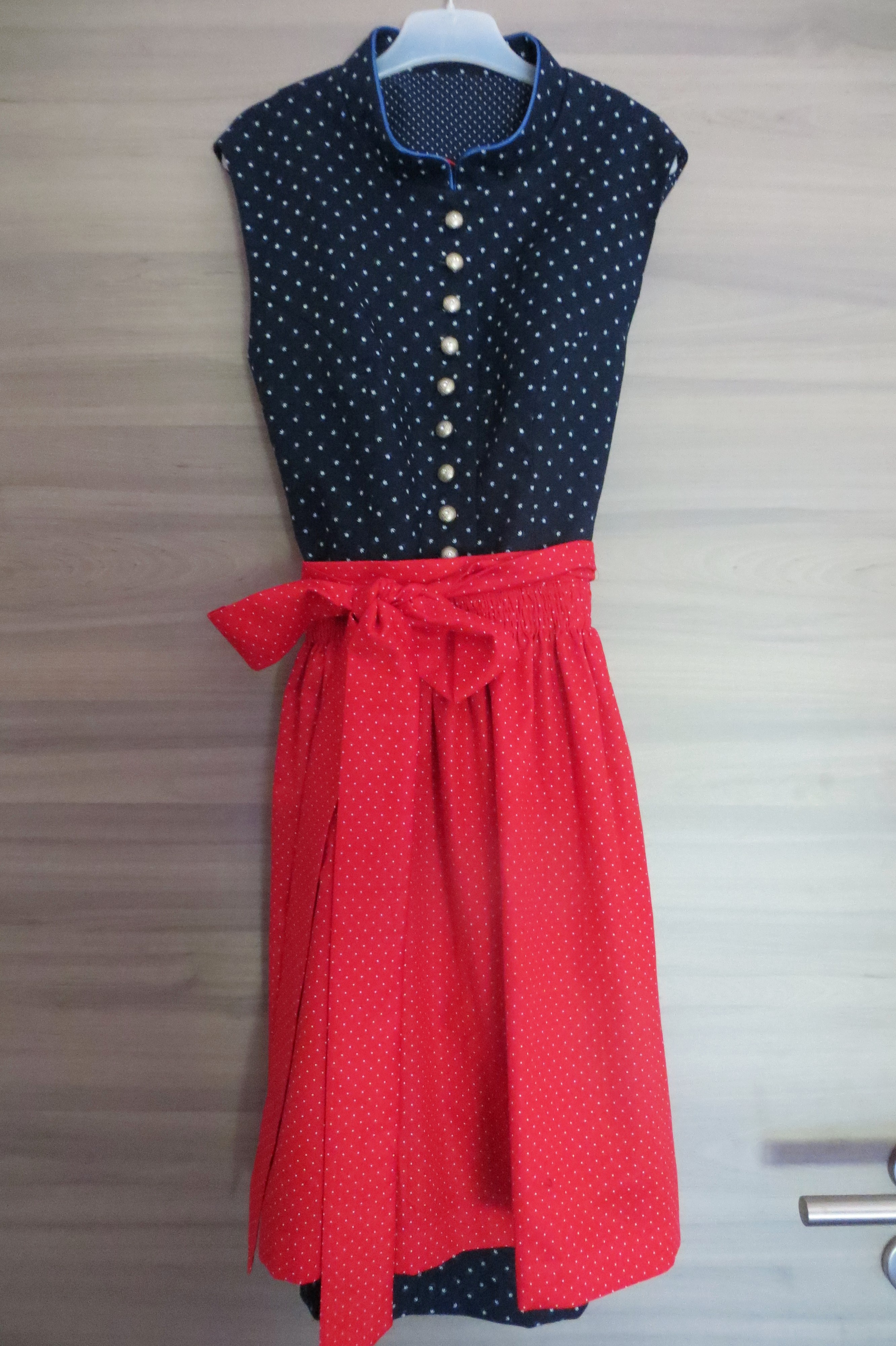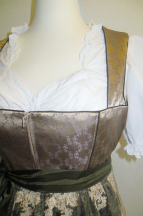 Das Set ist aus schönen Jaquard mit pinken und oliven Akzenten gefertigt. Das Dirndl hat einen Schneewittchenkragen und dazu eine zweite Schürze.